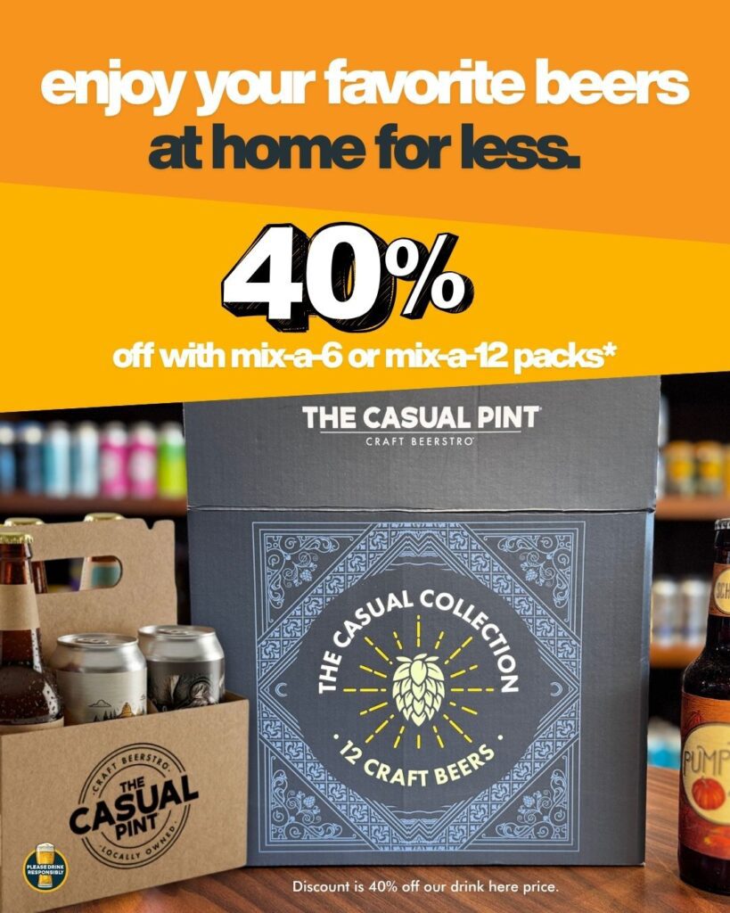 Choose from mix-a-six, package beer, crowlers, and growlers to savor your favorite brews at home. The Casual Pint makes it easy to keep the best craft beer near me at all times.